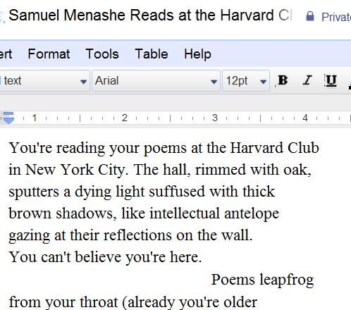 Note: Samuel Menashe is a real, living poet. I didn’t make him up. He lives in New York City. In 2004 he was – really! – awarded the “Neglected Masters Award” by the Poetry Foundation. The above poem is based on many true events jumbled by memory and then recorded years later by close attention to music and meter.