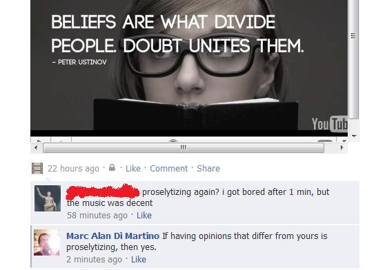 The meme is gaining ground. How does one combat the accusation that expressing one’s views is a form of proselytizing? Funny word, that; it’s clearly picked to draw a parallel between the ways of religious missionaries and the ways of outspoken non-theists. (We’re apparently unable to remember the Golden Rule: If you don’t believe in god, shut up and keep it to yourself. Doh!)
