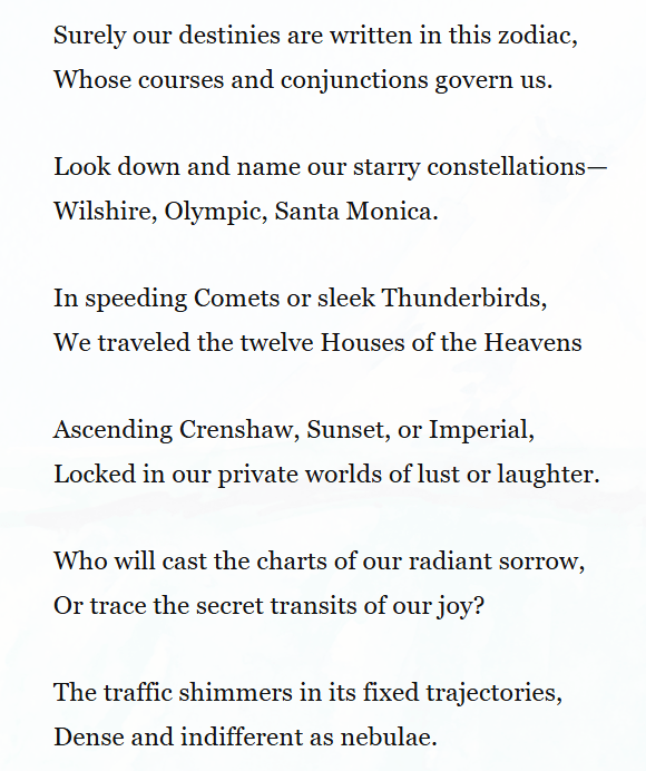 I have never been to Los Angeles, but it has always been a city I felt I knew through art, literature, music and cinema. This poem by Dana Gioia is one of the most magnificent poetic visions of the City of Angels I’ve ever read. If you’ve never read it, maybe now is the time. Read the full poem at Rattle. Here is a review of Gioia’s Meet Me at the Lighthouse I wrote for Italian Americana.