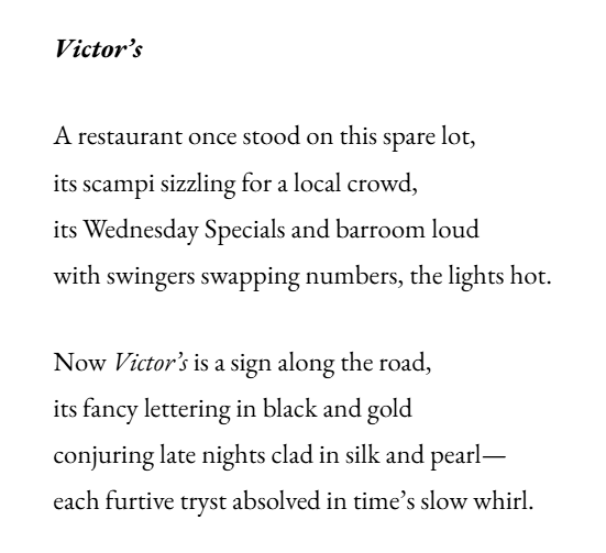 Today I’m posting a poem which was published in One Art back in December. It was written on a bus trip from Maine to Boston, and the initial inspiration came from an actual sign along the road not far from Boston. The sign – as I recall – read Victor’s, and I immediately began to sense the faded glamour of the place. These were the kinds of places my parents went with their friends, adult places (they were in their thirties!), exotic and forbidden. I tried to capture that feeling.