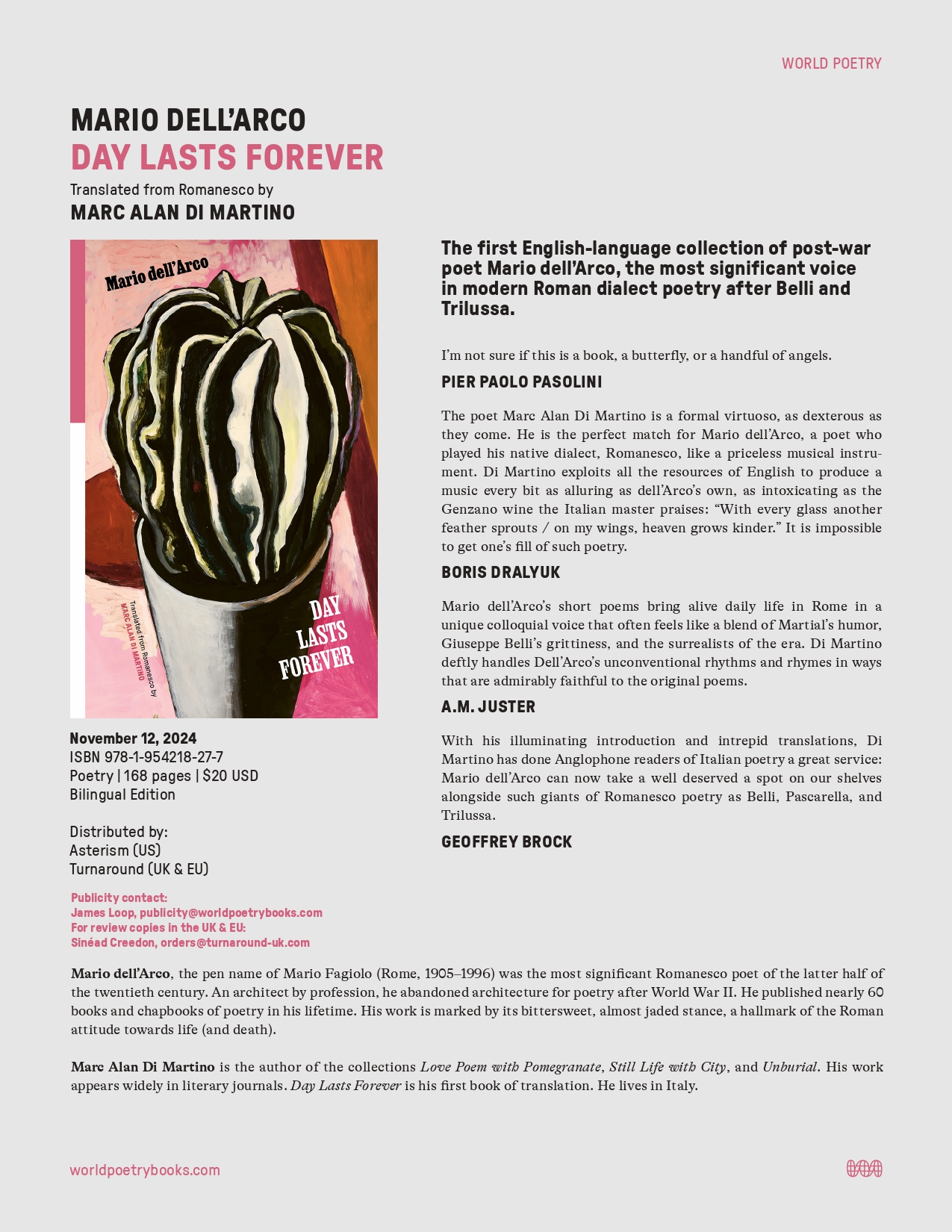 My translation Day Lasts Forever: Selected Poems of Mario dell’Arco, was published on November 12, 2024 by World Poetry Books. I worked on this book for nearly twenty years, since discovering dell’Arco in a long-gone secondhand bookshop in Rome. This will be the first book-length translation into English of one of the leading Romanesco poets of the twentieth century. (Romanesco is the dialect of modern Rome, a rich and expressive variant of Italian.)