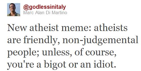 Stangroom surprised me, though, in a brief email exchange. After his pounding the nail on the head about how terribly nasty the gnus are, I expected him to be the very picture of politeness. Especially with his critics. But right out of the gate (on Twitter, no less) he told me I was making a fool of myself, intimated that I was out of my league, and that my opinion “wasn’t worth 2 cents.” One step short of telling me I had a stupid face, really.