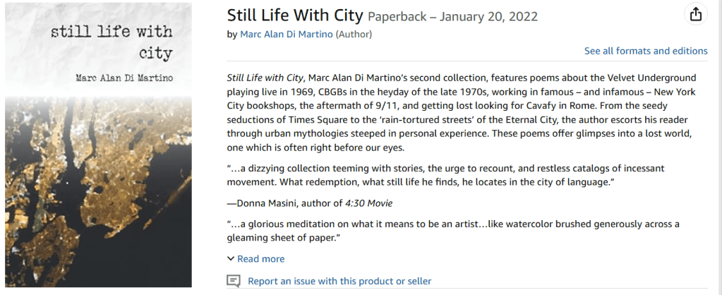 January 20, 2025 will be remembered for many reasons, and most of them bad. As we brace for whatever’s coming, I’m celebrating Still Life with City‘s third birthday! In summer 2022, my sister and I organized a book drive to send aid to Ukraine. Somehow we were able to drum up a few hundred dollars with this book, which we sent to beleaguered writers in Odesa. It may not be much, but one does what one can. It’s pretty affordable for a poetry book, so why not take a chance on it? Слава Україні!