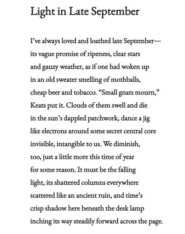 I have a new poem at SOFLOPOJO– or South Florida Poetry Journal* – called “Light in Late September”. It’s a bit of a companion piece to a poem I wrote a few years ago called “Sestina for the Falling Autumn Light“, a variation on the theme of the changing of the seasons, the waning of the light and the gradual entry into the dark half of the year. My birthday falls in late September, so I guess it’s a time of introspection for me. At that time last year I had just returned from a trip to the United States and was feeling hopful about the future of America and the world. The Harris campaign was in full swing, and it really looked like she had a strong chance at not only winning the election but winning decisively. So it goes.