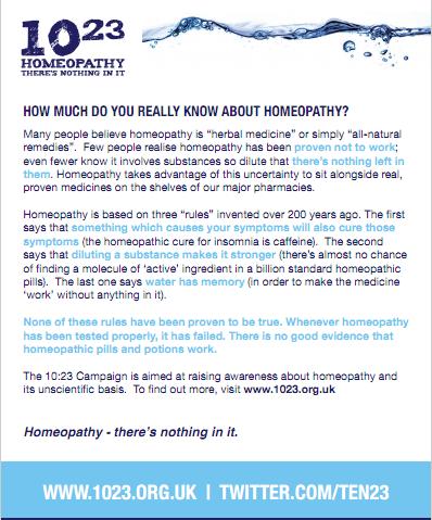 This weekend the 10:23 Challenge will be held across the world. That’s exciting, because any opportunity to poke a little fun at homeopathy is worth taking. I do it all the time, and the effects are strikingly similar to those of a full bottle of 30C Belladonna. Well, they’re a bit stronger really. Typical side effects include snickering.