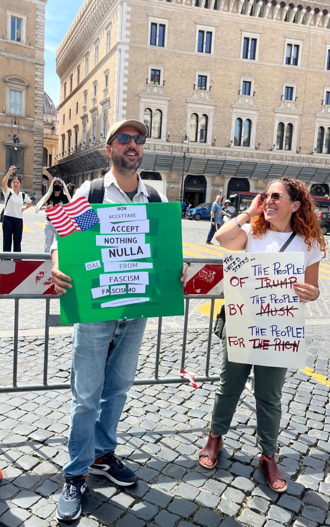 On May 3 we protested the rising tide of American fascism in Rome, right near Piazza Venezia. The sign I’m holding reads: “Accept nothing from fascism. Non accettare nulla dal fascismo.” It’s a quote from Italian poet, scholar and anti-fascist Lauro De Bosis, whose final act of resistance against Mussolini’s regime was to fly a small plane over Piazza Venezia and central Rome, disseminating hundreds of thousands of anti-fascist pamphlets overhead. He was never heard from again. His body was never found.