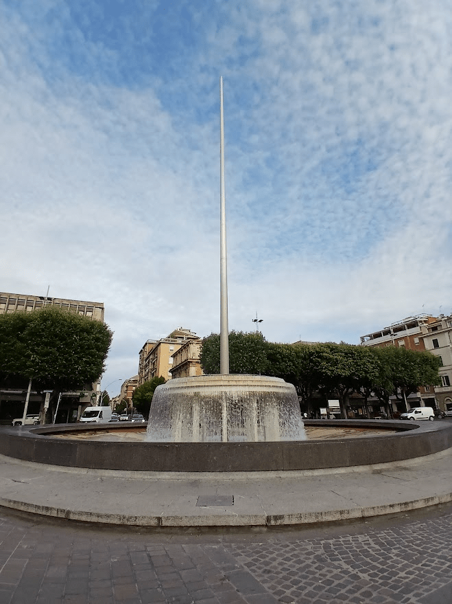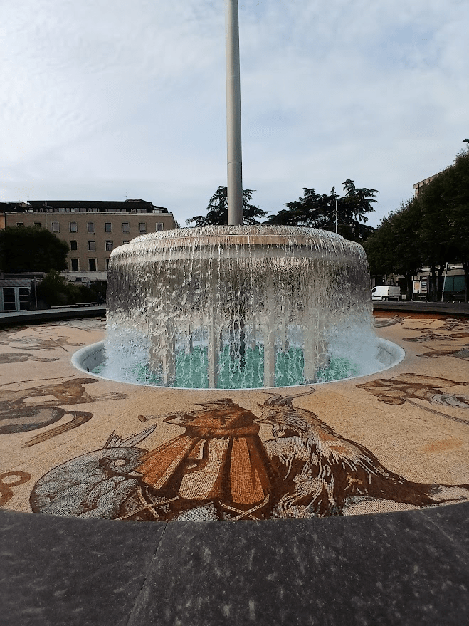 The first, below, is the Fontana dello Zodiaco (Zodiac Fountain) in Terni, which is essentially a ‘space needle’ surrounded by mosaics of the zodiac. Terni isn’t a terrible enchanting city, as far as Italy goes; it was bombed heavily during WWII as it was a major site of arms manufacturing, and the fountain was damaged as a result. After the war, it was reconstructed. The fountain dates from 1932-36, a full decade before Taja ch’รจ rosso! – his first collection – was published.