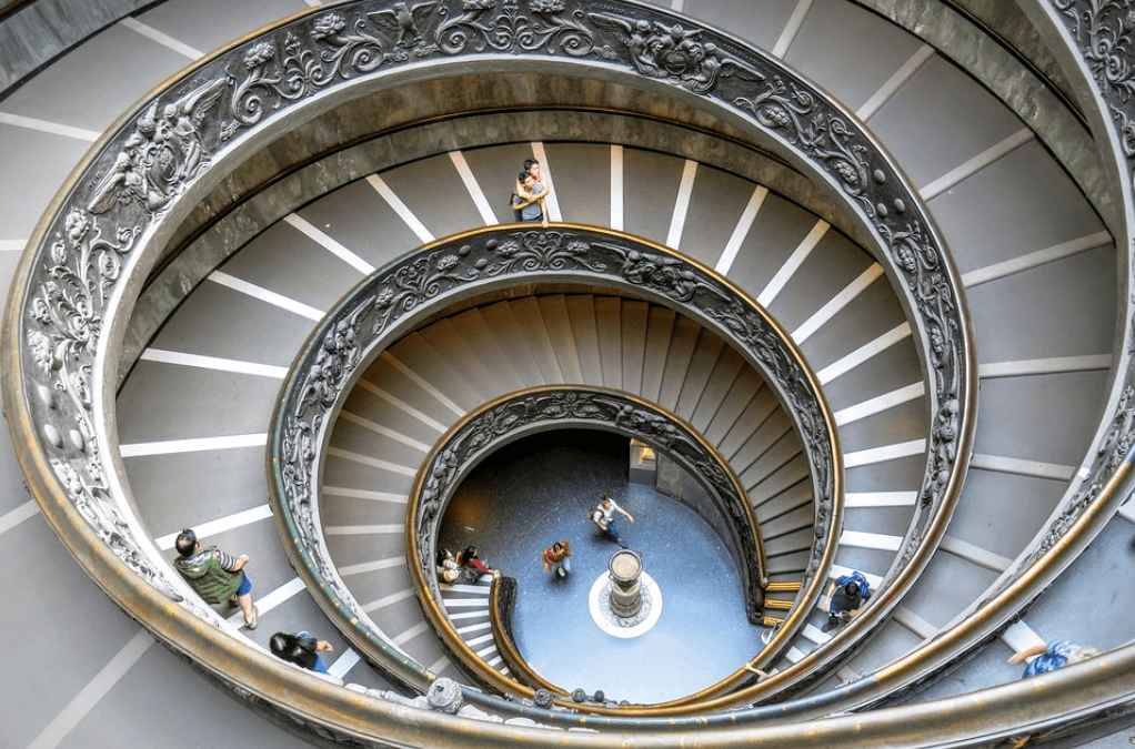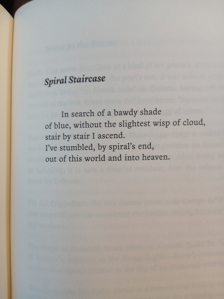 Architecture makes frequent appearances in Dell’Arco’s poetry, as one might expect. Even his nom de plume is a play on architecture: Dell’Arco, ‘of the Arch‘(itect). Here is one of my favorites, “Spiral Staircase”. The poem alludes to what in all probability is the spiral staircase of Bramante in St. Peter’s Basilica (below).